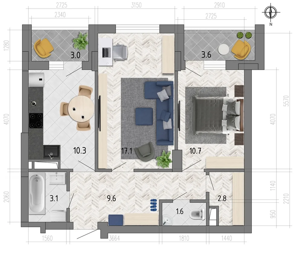 2-комнатная 58.3 м